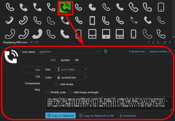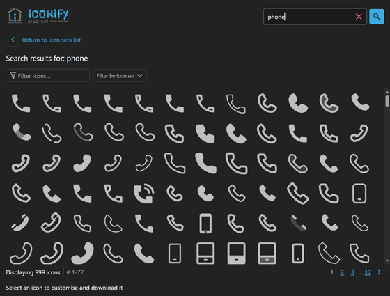例えば、「phone」と検索すると、以下のように複数のアイコンセットから「phone」に該当するアイコンのみが表示されます。