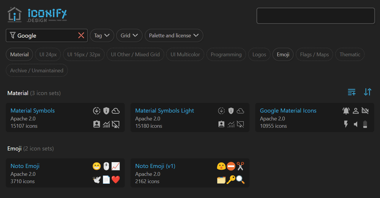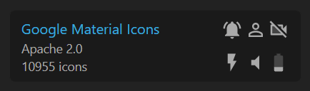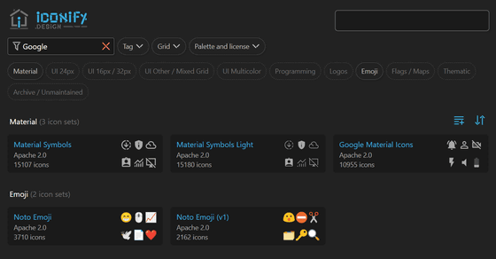 アイコンセットは青文字で表記され、その下にはライセンスが書かれています。Google Material Iconsの場合、ライセンスは「Apache 2.0」で、収録されているアイコンの総数は1万955点。右側に表示されているのは収録されているアイコンの事例です。