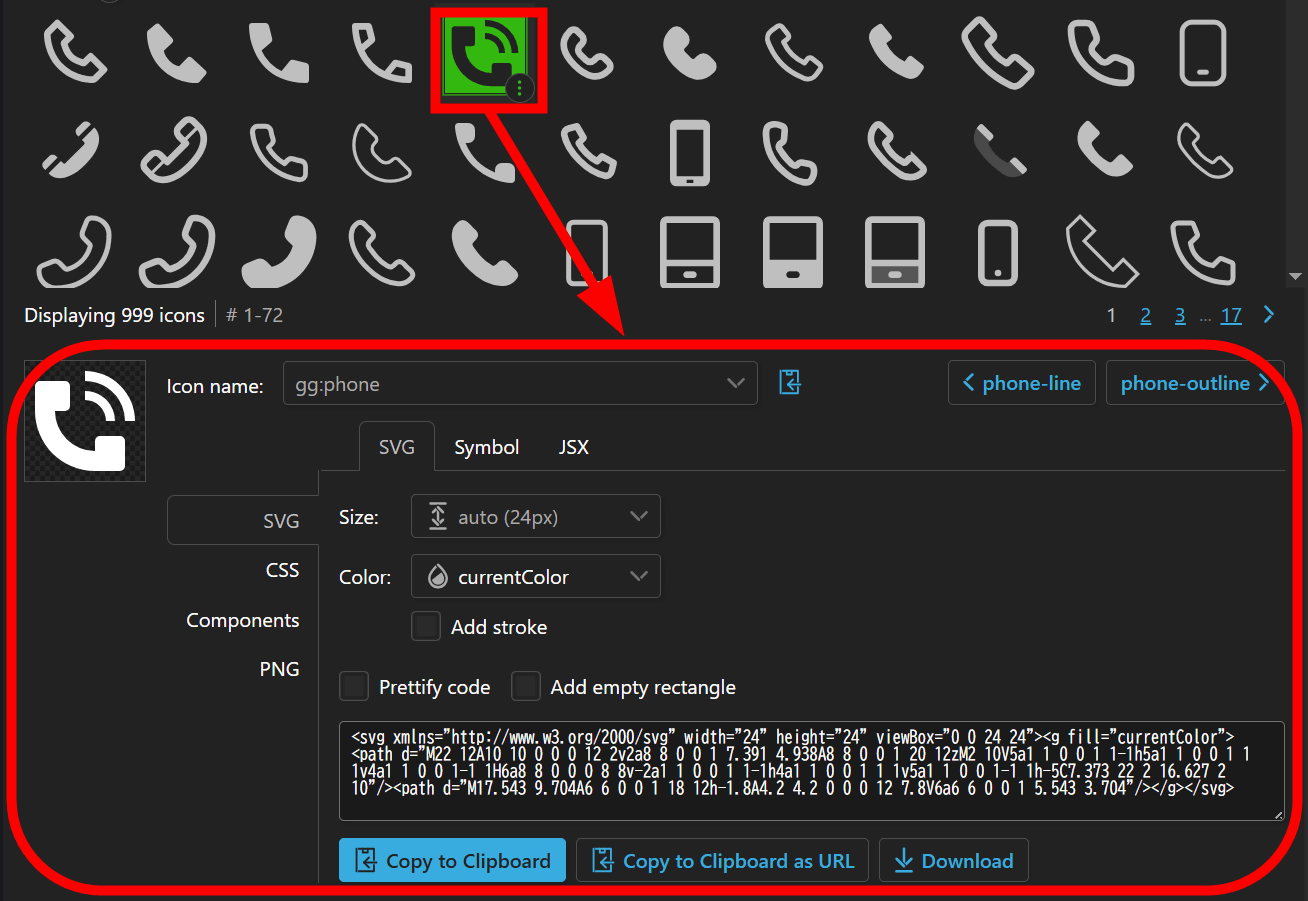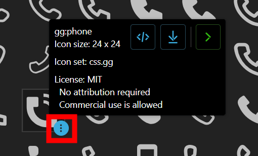 各アイコンの右下にある三点リーダーをクリックすると、アイコンのサイズ、収録されているアイコンセット、ライセンスをチェック可能。さらに、アイコンをSVG形式でコピーしたりダウンロードしたりすることもできます。
