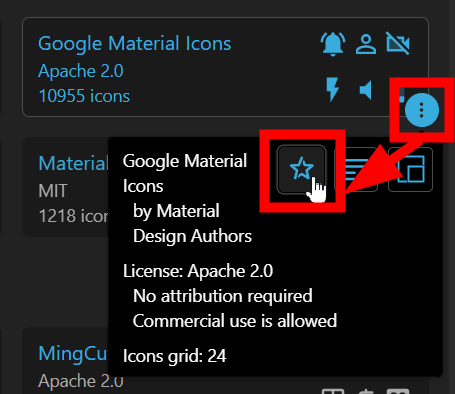 アイコンセットの右下にある三点リーダーから星型アイコンをクリックすると、お気に入り登録することができます。