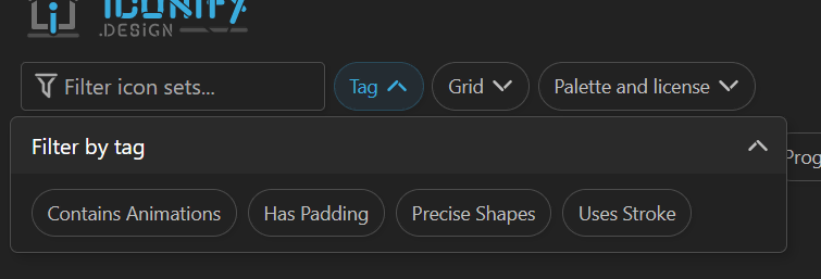 「Tag」では「Contains Animations」(アニメーションを含む)「Has Padding」(パディングを含む)「Precise Shapes」(精密な造形)「Uses Stroke」(線を使用している)といったタグを含むアイコンセットを表示できます。