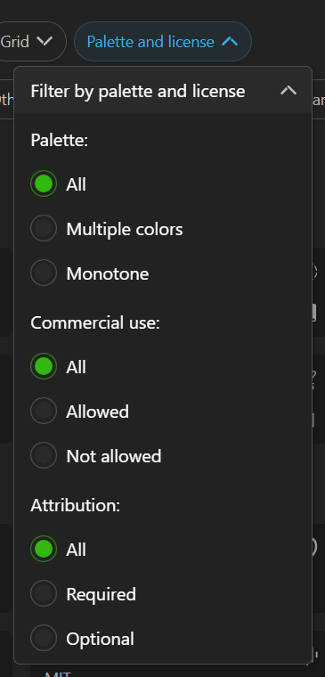 「Palette and license」では、アイコンセットがフルカラーかモノトーンかでフィルターしたり、商用利用可能かを否かでフィルターしたり、帰属表記が必要か否かでフィルターしたりすることが可能。