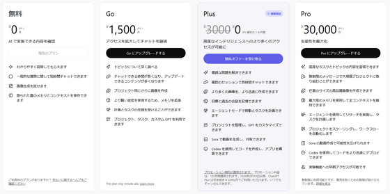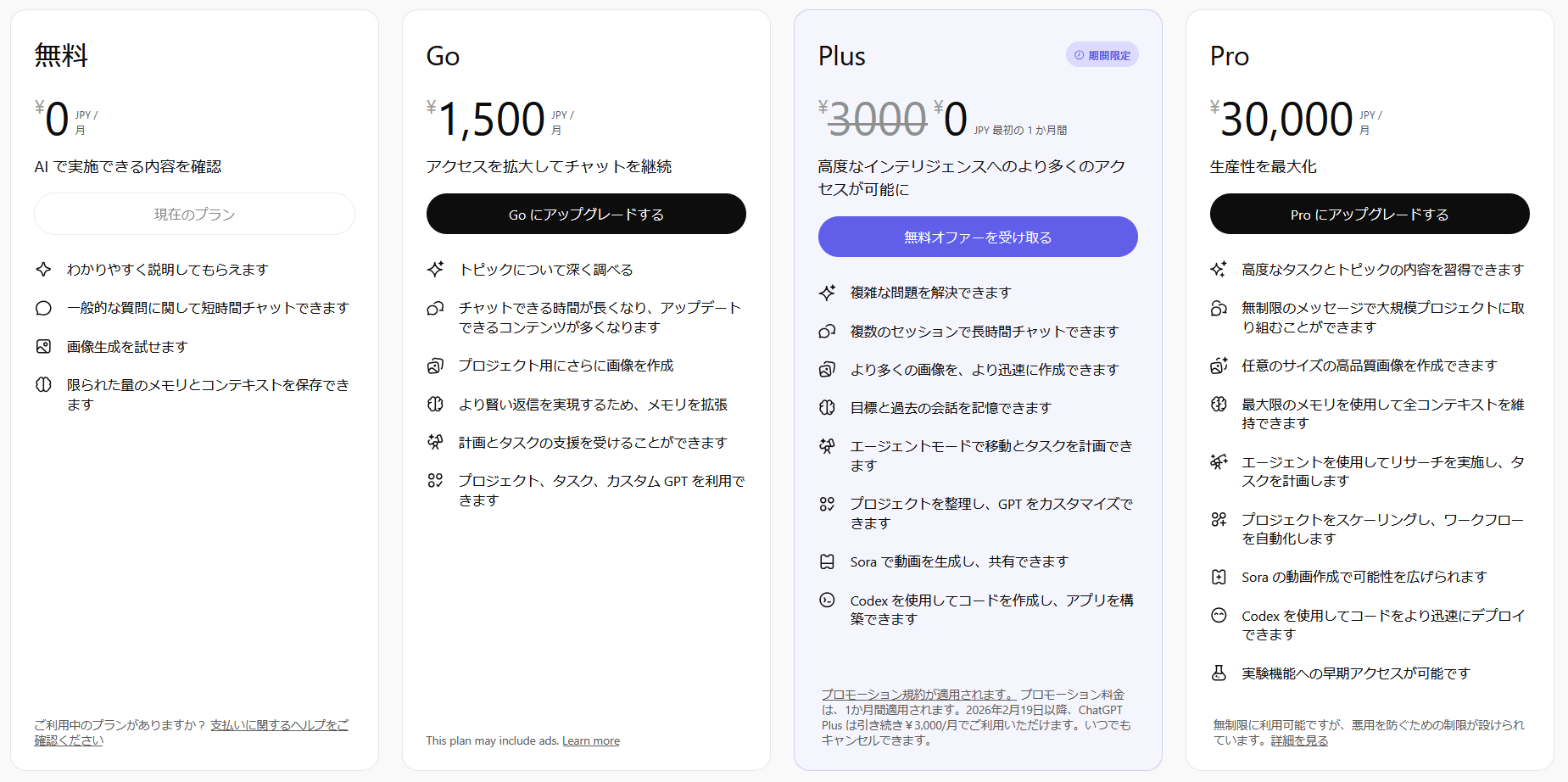 これで、ChatGPTの個人向けサブスクリプションプランは無料プランとChatGPT Go、ChatGPT Plus、ChatGPT Proの4種類になります。