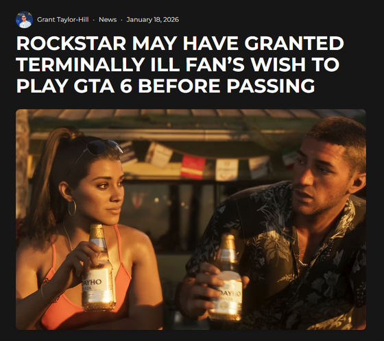 グランド・セフト・オート(GTA)シリーズの最新作となる「グランド・セフト・オートVI(GTA6)」は、2022年2月に開発が発表され、当初は2025年後半に発売される予定でしたが、二度の延期で発売日は2026年11月19日まで遅れる羽目となっています。そんなGTA6の発売を待ち望んでいるという末期がんのファンに、販売元のRockstar GamesがGTA6の早期アクセス権を提供した可能性があると話題となっています。