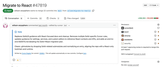 別の実験では、CursorのコードベースでSolidからReactへのインプレースでの移行を実施。3週間以上かかったものの、26万6000行を追加して19万3000行を削除する大規模更新に成功しました。