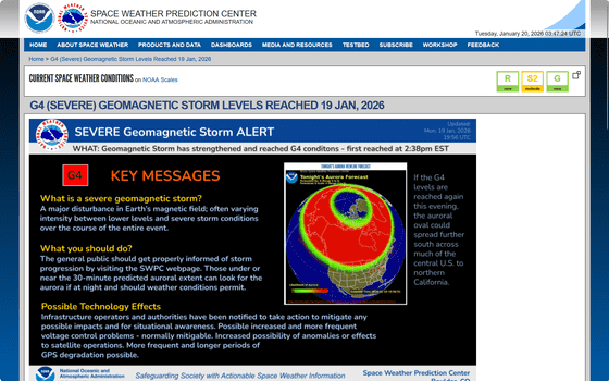 アメリカ海洋大気庁傘下の宇宙天気予報センターによると、1月20日に太陽のコロナ質量放出(CME)が地球に到達すると共にG4(深刻)レベルの地磁気嵐が発生したとのこと。気象庁によれば、地磁気嵐とは「太陽面での大規模な爆発により放出された高エネルギー粒子が地球に到達した際に観測されるような顕著な地磁気擾乱(じょうらん)」のことを言います。