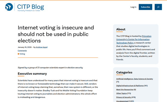 インターネットの普及により、日本でもインターネットを活用した選挙運動が解禁されていますが、記事作成時点では公職選挙法においてインターネットによる投票は認められていません。日本でも導入について議論されているインターネット投票ですが、世界の一部の国ではインターネット投票が既に実施されています。しかし、このインターネット投票は安全ではないため、公の選挙では使用すべきではないと、プリンストン大学の情報技術政策センターが運営するCITP Blogが解説しました。