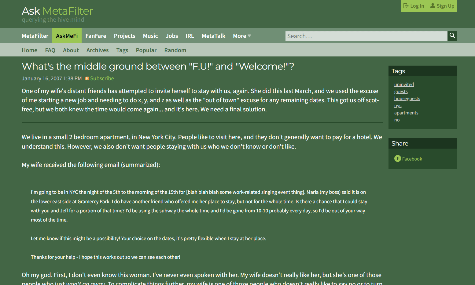 コメントの内容は、「ニューヨークの2ベッドルームの小さなアパートに住む投稿者が、パートナーの遠い知人から『また』長期滞在の申し出を受けて困っている」という相談です。相手は「投稿者夫婦の家に泊めてもらえないか、日中は外出していて邪魔にならないはずだ、日程は柔軟に調整できるので可能性があるか教えてほしい」と頼んできたとのこと。投稿者はその女性とほとんど面識がなく、パートナーも好意的ではないのに、相手は粘り強く連絡してきたそうです。
