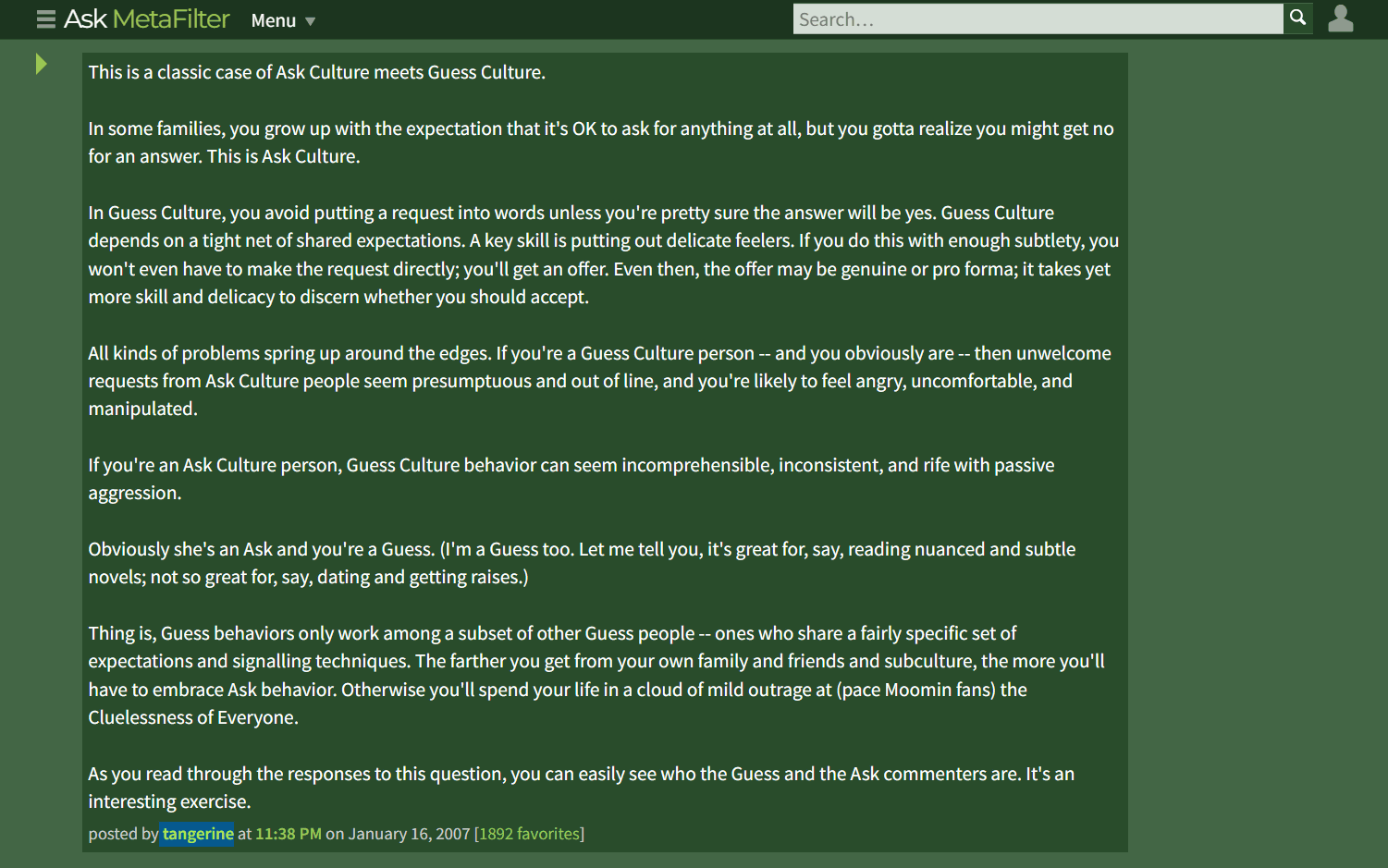 これに対して、掲示板ユーザーのtangerine氏が、この問題の核心は「Ask Culture(質問文化)とGuess Culture(推測文化)の衝突」だとコメントしました。