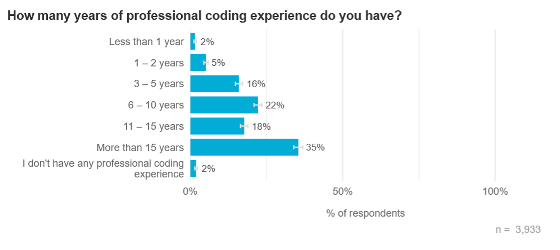 職業プログラマーとしての経歴は15年以上のユーザーが35%で最も多く、1年未満のユーザーは2%でした。
