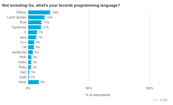 Go言語以外のお気に入り言語は1位がPython(18%)、2位が決められないよ!(14%)、3位がRust(11%)とTypeScript(11%)でした。