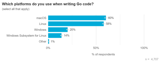 コーディングに用いるプラットフォームはmacOSが60%、Linuxが58%、Windowsが20%、WSLが14%。