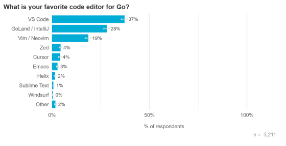コーディングに使っているエディターは1位がVS Code(37%)、2位がGoLand(28%)、3位がVimおよびNeovim(19%)でした。Rust製エディターのZedとAI搭載エディターのCursorが4%で同率4位です。