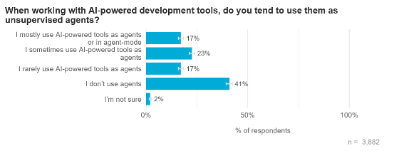 AIツールをエージェントとして使っているか否か尋ねた質問では、よく使っている回答者が17%、ときどき使っている回答者が23%、たまに使っている回答者が17%、使っていない回答者が41%でした。