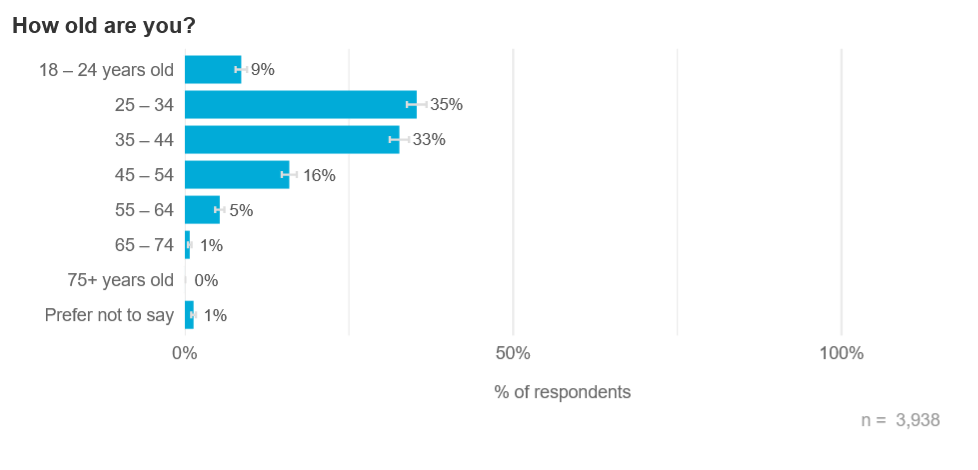 職業プログラマーとしての経歴は15年以上のユーザーが35%で最も多く、1年未満のユーザーは2%でした。
