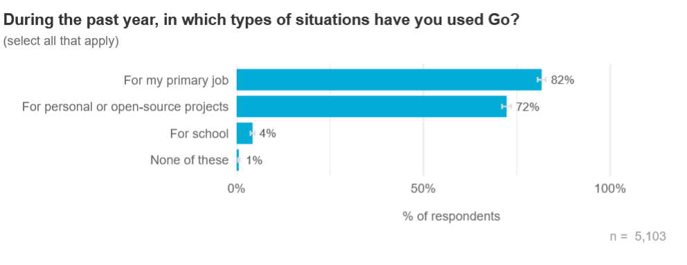 回答者のうち82%がGo言語を仕事で使っており、72%は個人的プロジェクトやオープンソースプロジェクトに使っています。学校で使っているユーザーは4%でした。