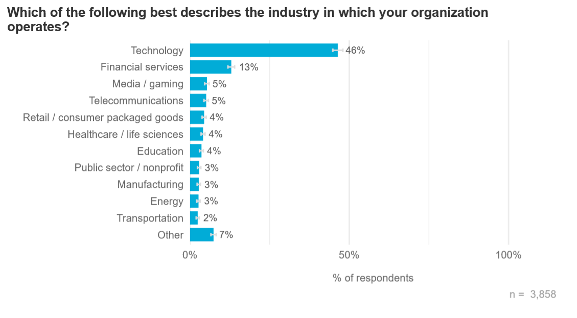 勤務先の職種は、テクノロジー企業が46%で、ファイナンシャルサービスが13%。