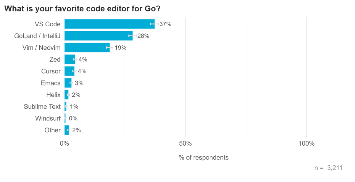 コーディングに使っているエディターは1位がVS Code(37%)、2位がGoLand(28%)、3位がVimおよびNeovim(19%)でした。Rust製エディターのZedとAI搭載エディターのCursorが4%で同率4位です。