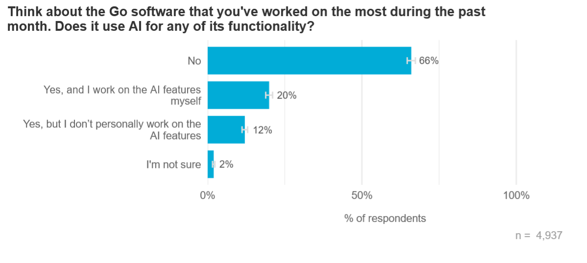 Go言語で開発したソフトウェアにAI機能が含まれているか尋ねる質問では66%が「AI機能を含んでいない」と回答。「自分で開発したAI機能を含んでいる」という回答は20%で、「自分はAI機能を開発していないけど、完成したソフトウェアはAI機能を含んでいる」という回答は12%でした。