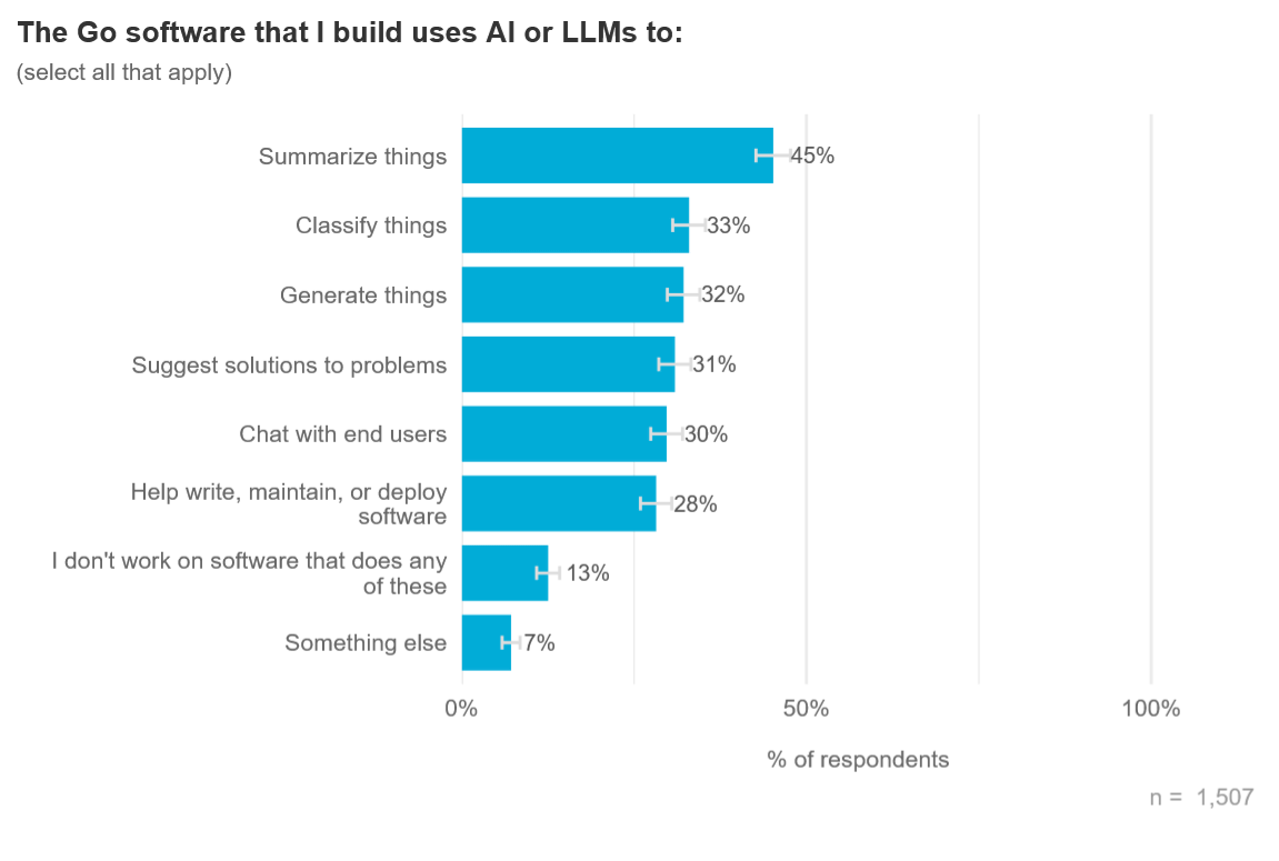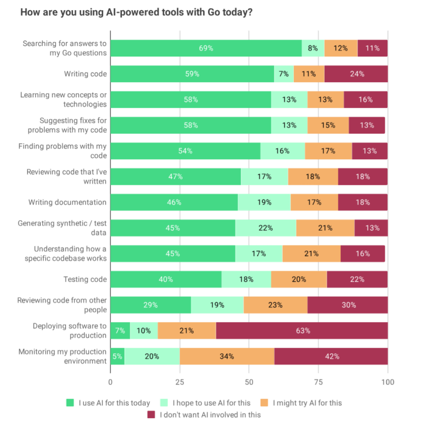 AIツールの使用目的では「Goに関する質問の答えを探す」「コードを書いてもらう」「新技術のコンセプトを学ぶ」といった用途が多いです。一方で、「他人が書いたコードをレビューする」「ソフトウェアを本番環境にデプロイする」「本番環境をモニタリングする」といった用途に用いている人は少ないです。