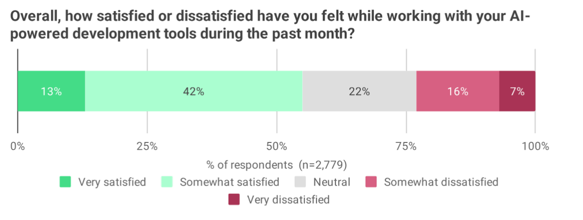 ソフトウェア開発にAIツールを使うことに満足しているか否か尋ねた質問では、13%が満足、42%がおおむね満足、22%が中立、16%がおおむね不満、7%が不満と回答。