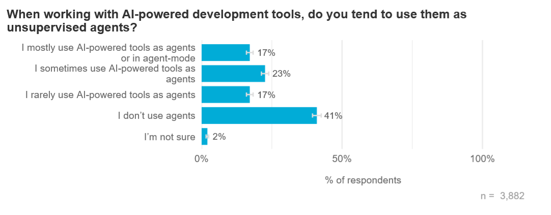 AIツールをエージェントとして使っているか否か尋ねた質問では、よく使っている回答者が17%、ときどき使っている回答者が23%、たまに使っている回答者が17%、使っていない回答者が41%でした。
