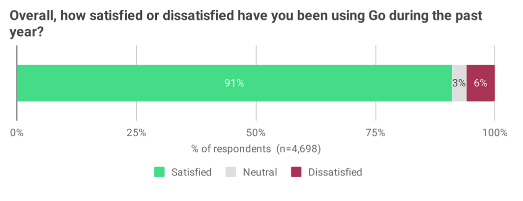 Go言語に満足しているか否かを尋ねる質問では91%が満足と回答。