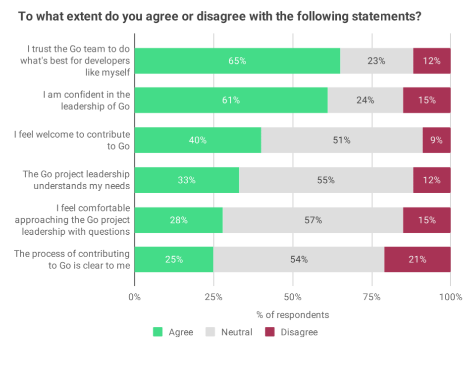しかし、「Go言語のコントリビューションプロセスは自分にとって分かりやすい」と回答した人は25%、「Go言語プロジェクトの疑問に対するリーダーシップは良好だ」と回答した人は28%にとどまり、Go言語プロジェクトには課題が残っていることも分かっています。
