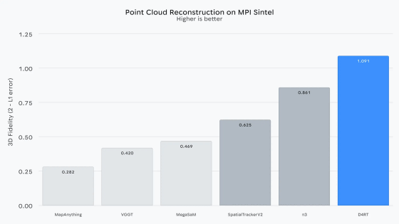 既存のAIモデルで同様の4次元認識システムを構築するには「深度認識AI」「動体認識AI」「カメラアングル認識AI」といった複数の専用AIモデルを組み合わせる必要があり、処理に時間がかかっていました。一方でD4RTはTransformerベースの単一モデルで必要な処理を実行可能であり、精度とスピードを両立することに成功しています。