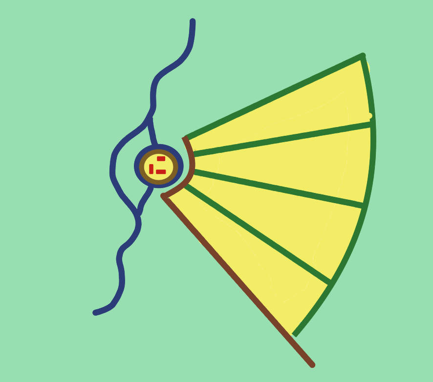 まず、考古学や歴史研究に基づくと、初期段階の集落は特定の設計に基づいて計画され配置されていたと考えられています。以下は、西暦1000年から1300年ごろのオランダ南部に発展した「西ブラバント」の円形荘園のスケッチです。青い線で描かれた川の近くに掘のある屋敷が建設され、そこから放射状に広がるように農場区画が設けられていたことを示しています。このような荘園は「BORCH(ボルフ)」と呼ばれています。