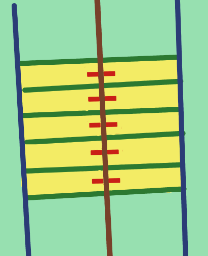 また、以下は街路集落のスケッチで、近隣の湿地帯の開発を念頭に立てられています。道路を垂直に区切る形で、農場とそれに付随する均一な大きさの長方形の区画が一列に並んでいます。