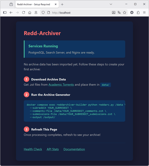 ブラウザで「http://localhost/」を更新すると、今回作成したアーカイブの統計情報が表示されます。サブレディット名をクリックすると…
