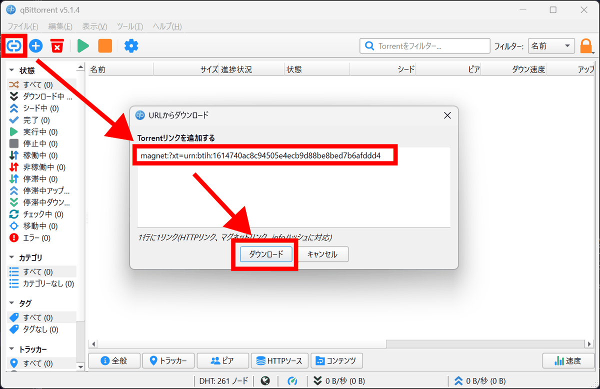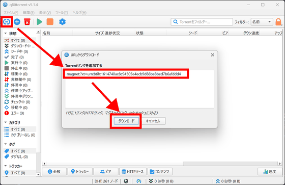 qBittorrentを起動し「リンク追加」ボタンからマグネットリンクを入力し「ダウンロード」をクリック。