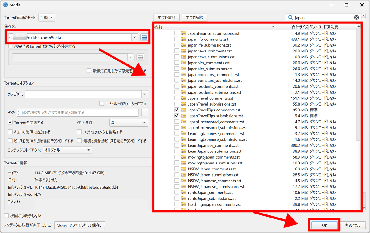 ファイルの一覧が表示されるので、1つのサブレディットの元の投稿とコメントのセットのデータを選択、保存先をredd-archiverフォルダ下のdataフォルダに設定して「OK」をクリック。