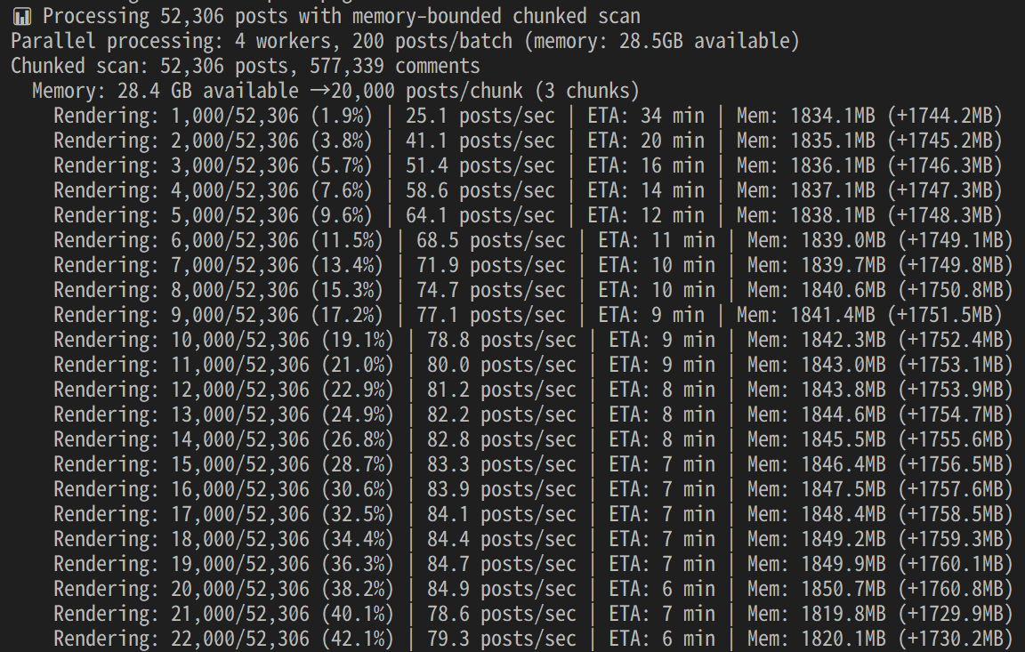 なお、見積もりとして100GB分の投稿データのZSTファイルはHTML化すると1.5TBになり、データベース用には160GBの容量が必要とのことです。Redd‑Archiverでは適度に分散させたインスタンスを用意することを推奨しています。
