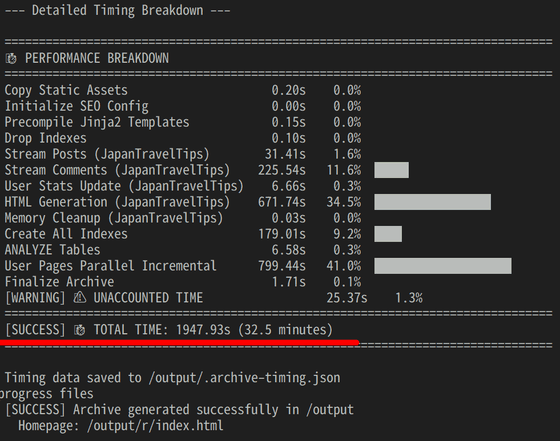 作業が完了し、それぞれの作業の内訳が出力されています。今回は約33分程かかりました。