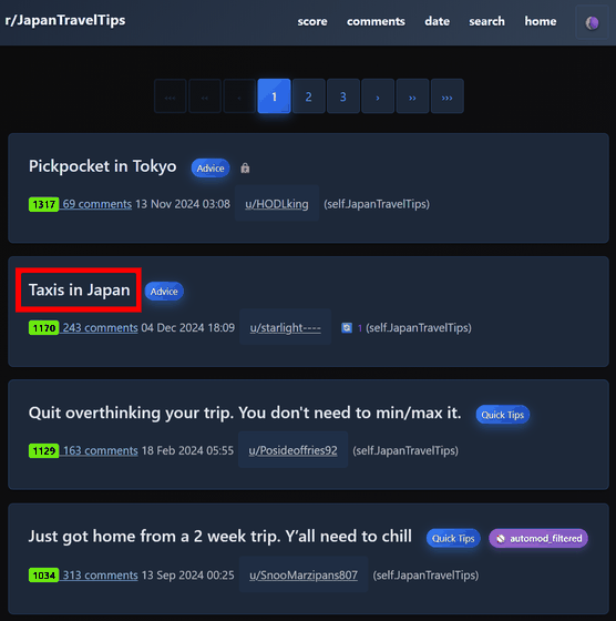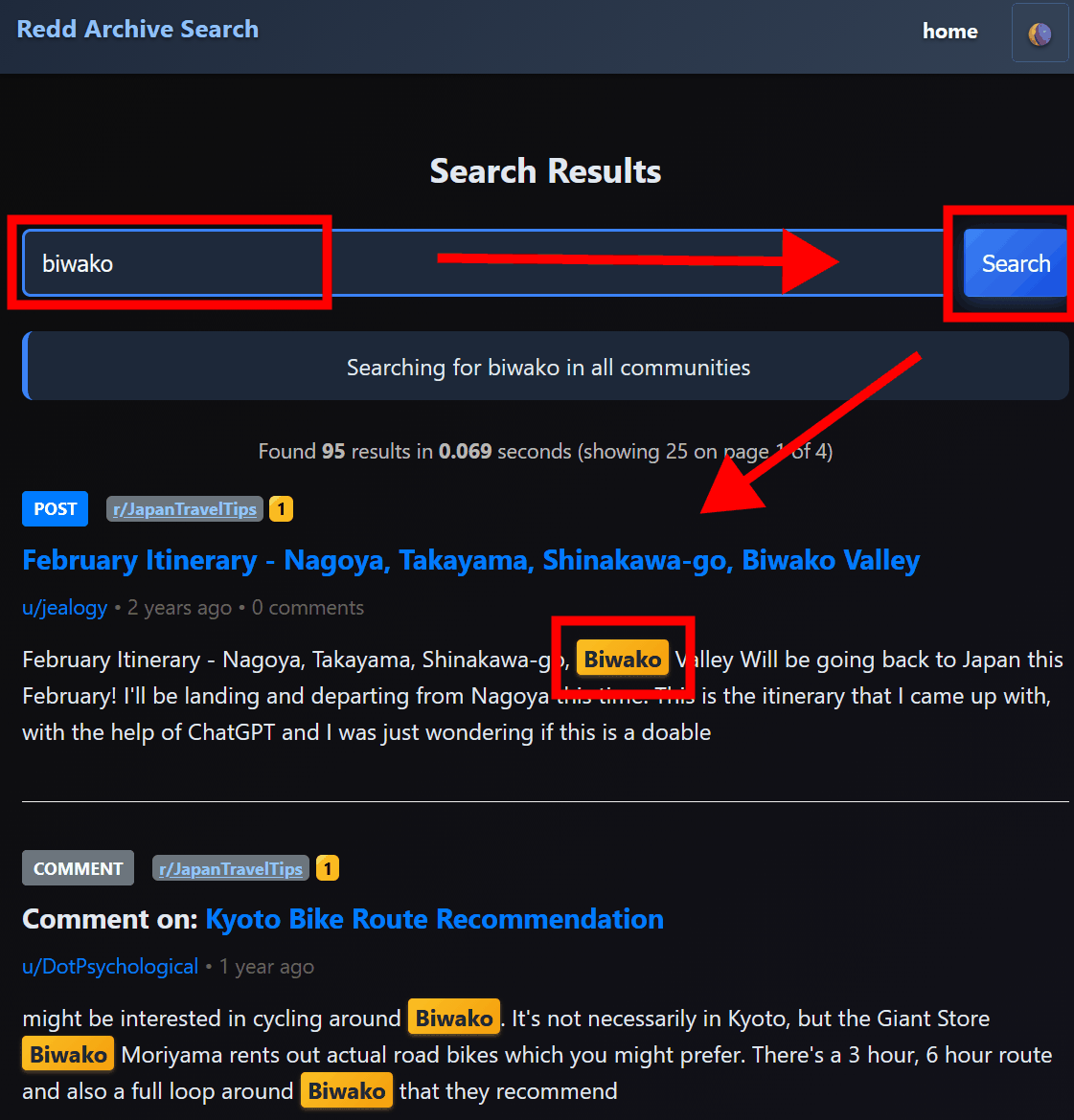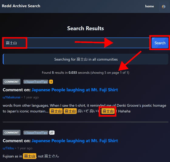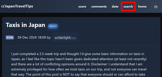 検索ページが表示されるので検索したいキーワードを入力して「search」をクリックすると、キーワードを含む投稿のリストが表示されます。