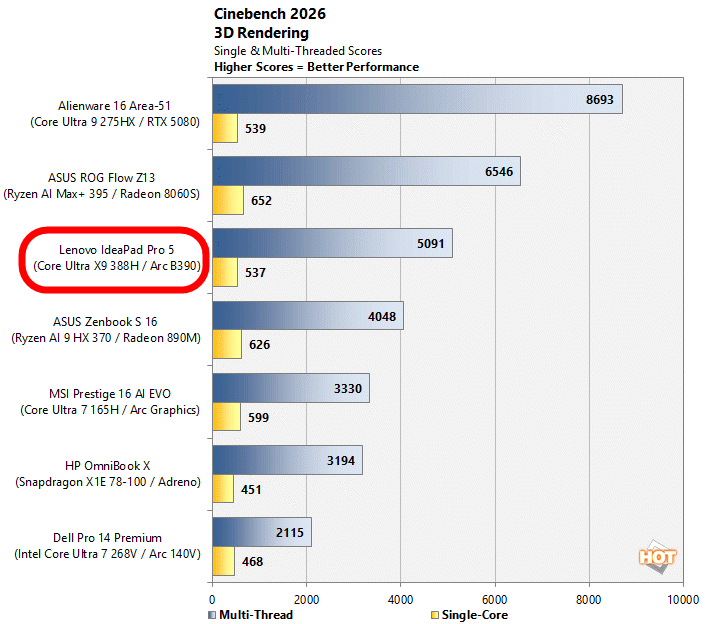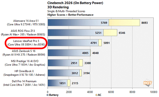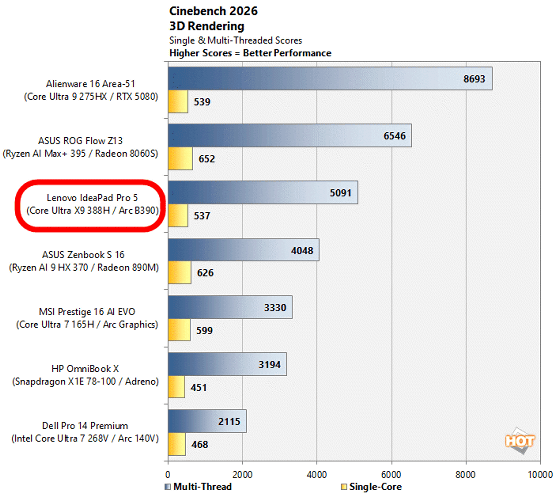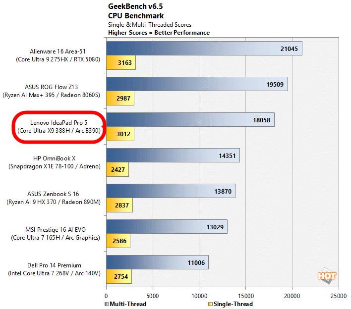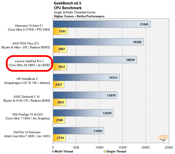 HotHardwareはCore Ultra X9 388Hを搭載した「Lenovo IdeaPad Pro 5」を入手して各種ベンチマークを実行しています。GeekBench 6でのベンチマーク結果は以下の通り。Core Ultra X9 388Hのマルチコアスコアは1万8058でSnapdragon X 1E-78-100を搭載したPCを上回りました。シングルコアスコアは3012でRyzen AI Max 395を超えています。