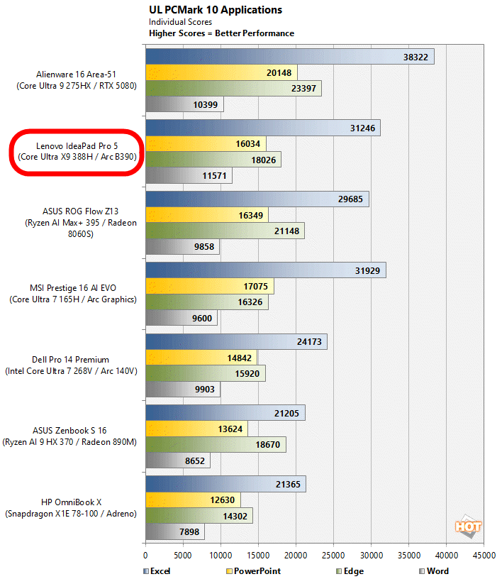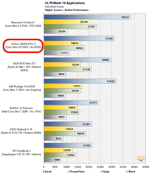 実際のPC用途に近いテストを実行できるPCMarkの結果が以下。Core Ultra X9 388HはExcelテスト(青色)でRyzen AI Max 395を上回りました。