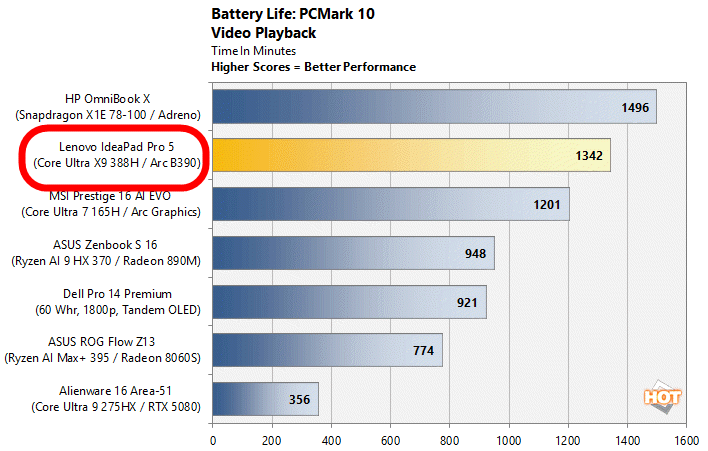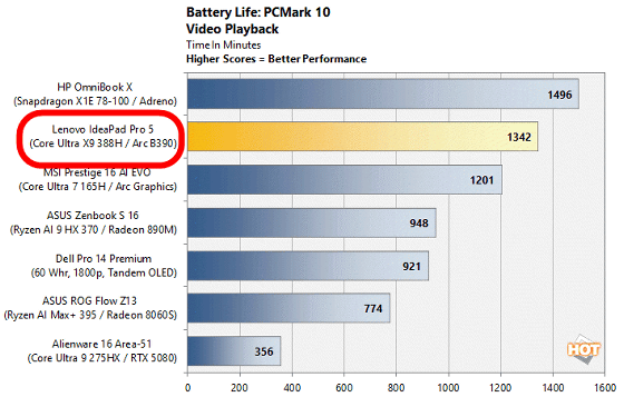 バッテリー駆動時の動画再生時間を測定するテストでは1342分(22時間22分)にわたって動画を再生することに成功。ArmプロセッサのSnapdragon X 1E-78-100には及ばないものの電力効率の高さが際立っています。