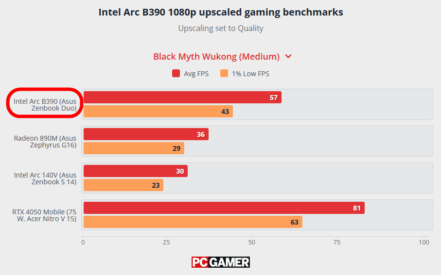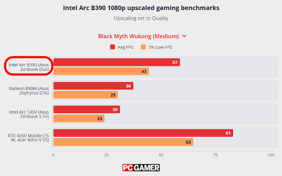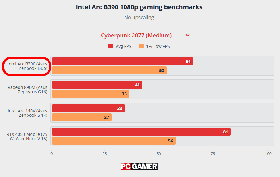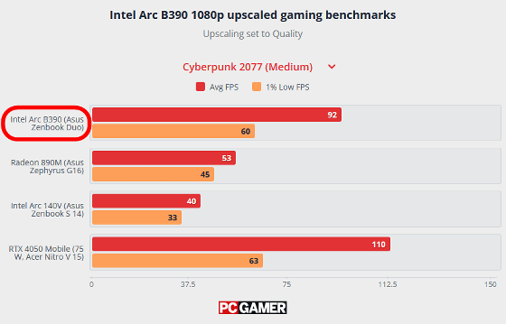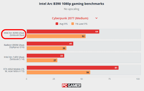 PC GamerはCore Ultra X9 388Hを搭載したZenbook Duo 2026でゲーム性能のテストを実施しています。「Cyberpunk 2077」をフルHDのMedium設定で動作させた際の平均FPSは64FPSでした。RTX 4050を搭載したPCよりは低い性能ですが、平均が60FPSを超え、FPS低下時も52FPSに抑えられているので十分快適にプレイ可能です。
