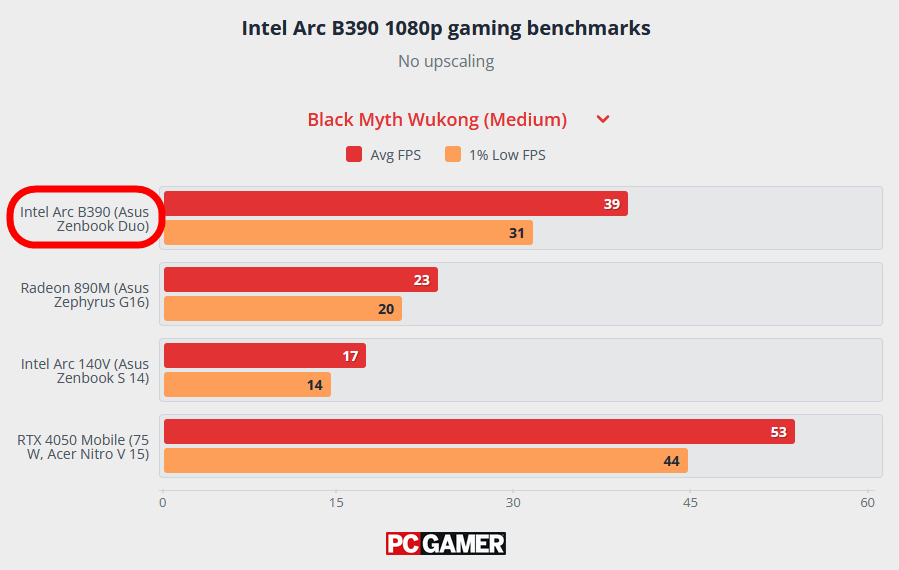 重量級ゲームの「黒神話:悟空」をフルHDのMedium設定でプレイした場合、平均FPSは39FPSです。