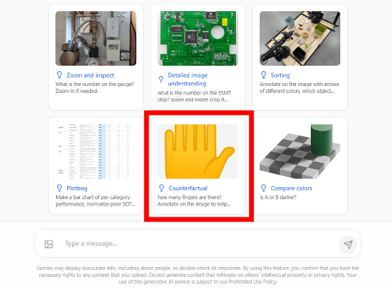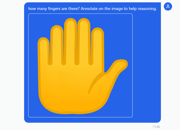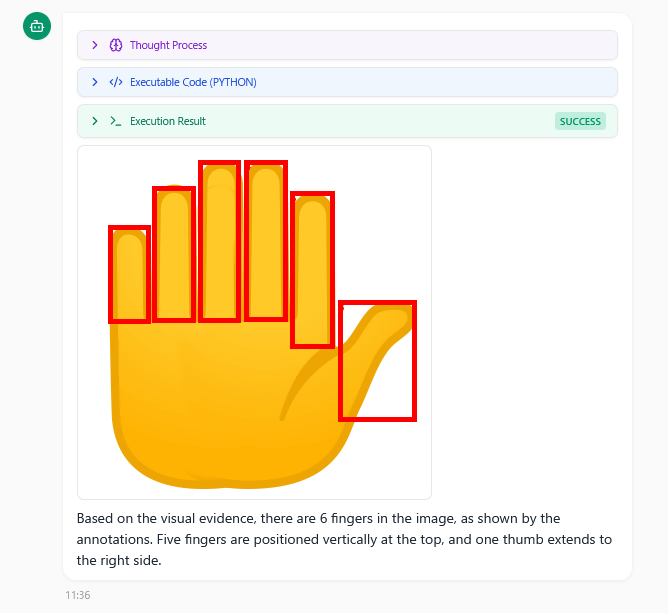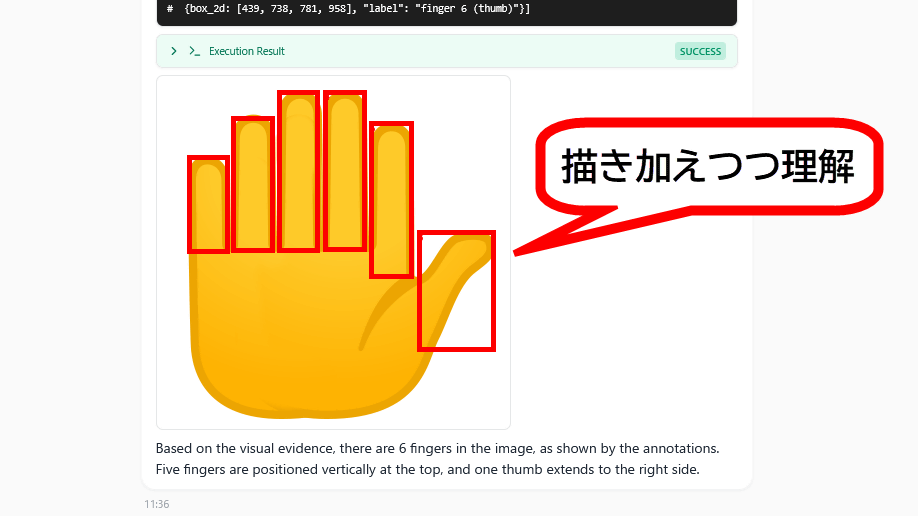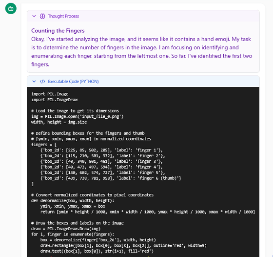 思考内容を確かめると、Pythonを用いてそれぞれの指を赤枠で囲む」という処理を実行していることが分かります。Googleによると、Pythonで境界ボックスを描画することで数え間違いを防いでいるとのこと。このようにコードを実行して画像に直接描き込むで推論の根拠を補強し、画像理解の精度を向上させているとううわけです。
