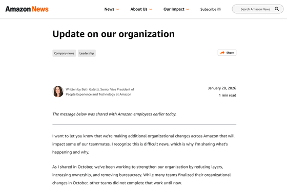 Amazonが2025年10月に続く2度目の大規模レイオフの実施を発表しました。アンディ・ジャシーCEOは企業文化をリセットし、「官僚主義的」な部分の排除を目指しているとのことです。