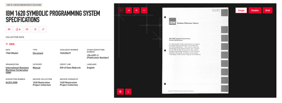 書類では、IBM 1620のシンボリックプログラミングシステムの仕様書などが収蔵されています。