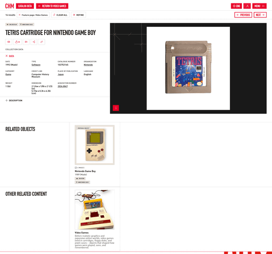 登録されているコレクションはいろいろ。たとえば、ゲームボーイ向け「テトリス」のカートリッジのページはこんな感じ。ゲームソフトに関する情報が登録されているほか、関連するオブジェクトのページに飛ぶことができます。