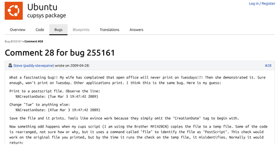同様の「火曜日には印刷されない」というバグ報告は「Bug #248619」でも語られており、「ファイルの4番目のバイトに『Tue』が含まれていることで、PostScript形式とは別のErlang JAMファイルであると判断されます」と説明されています。「Bug #248619」は2009年10月公式リリースの「Ubuntu 9.10」で修正されています。