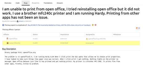 そんなUbuntuでかつて利用されていた「cupsys」というパッケージに関するフォーラム「Bug #255161」では、cupsysで多数報告されていた印刷関連の不具合に関するコメントが投稿されています。