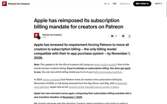二転三転するルールにPatreonは「この決定には強く反対します」と宣言。「Appleの要件変更によってクリエイターの皆様がこのような立場に立たされたことを大変残念に思います」と伝えました。
