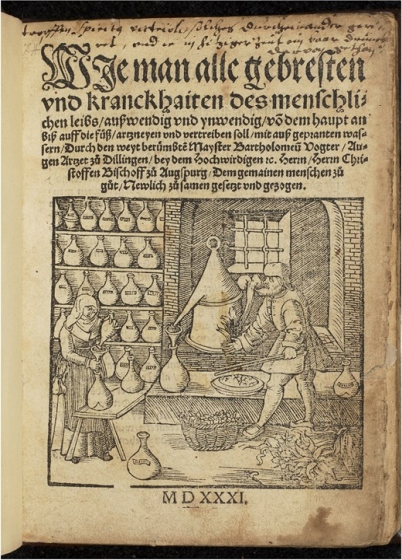 研究チームが分析の対象としたのは、1531年にドイツのアウクスブルクで出版された本です。この本は眼科医であるバルトロメウス・フォークトヘルがまとめた庶民向けの治療の手引き集で、脱毛・口臭・傷など日常的な不調への対処法が書かれています。以下は1531年版の扉絵で、家庭で蒸留作業に取り組む様子が描かれています。